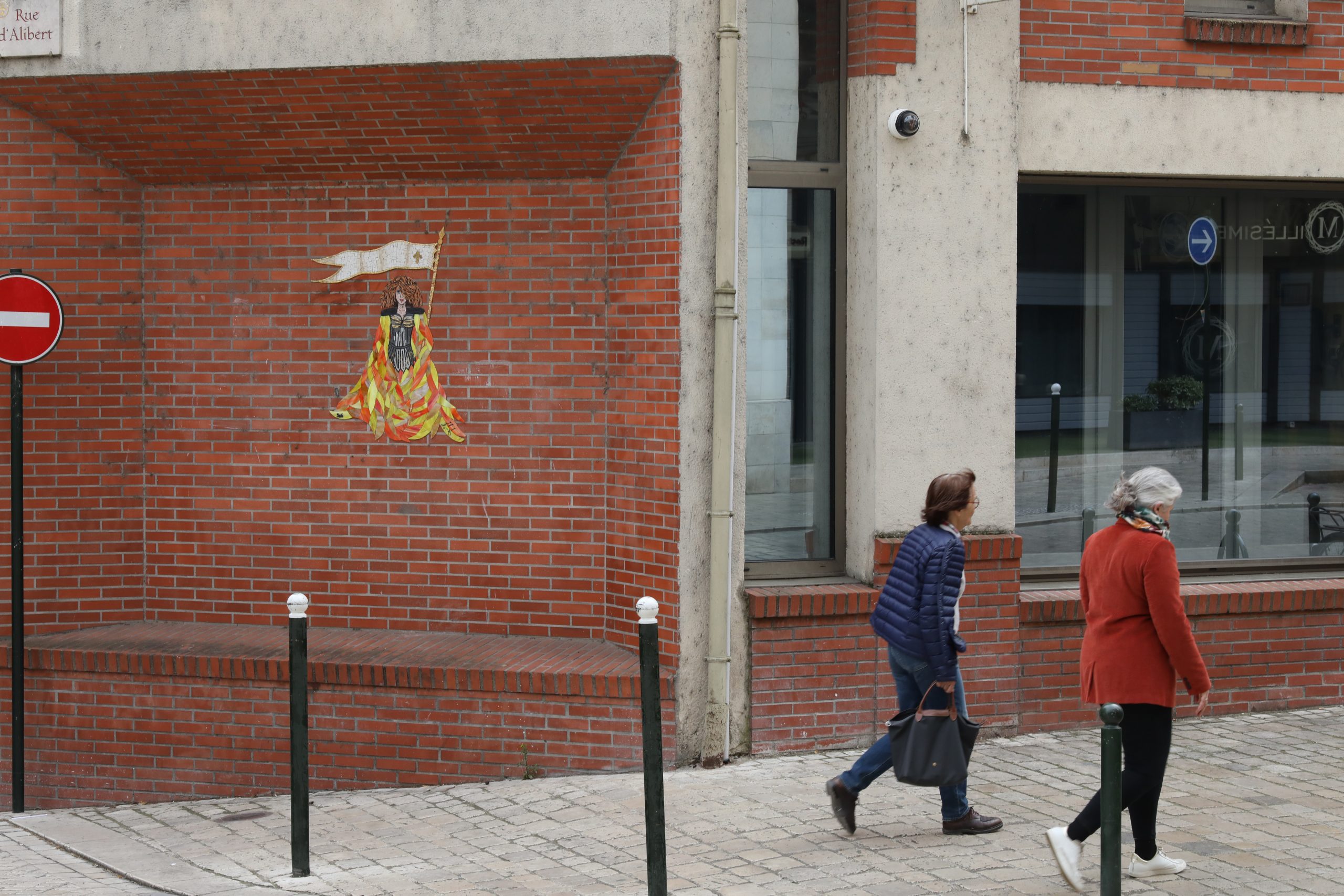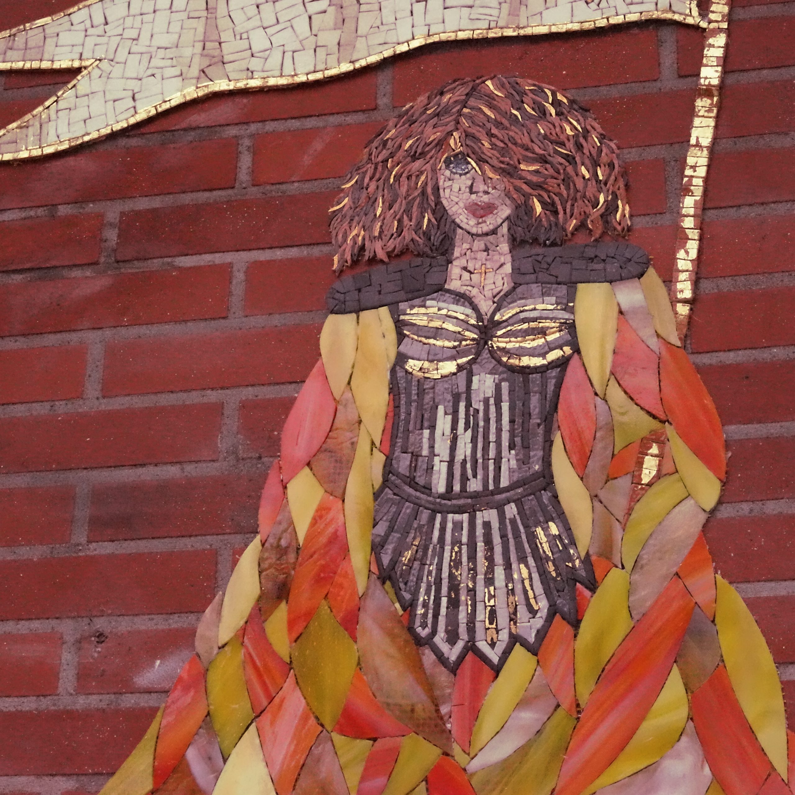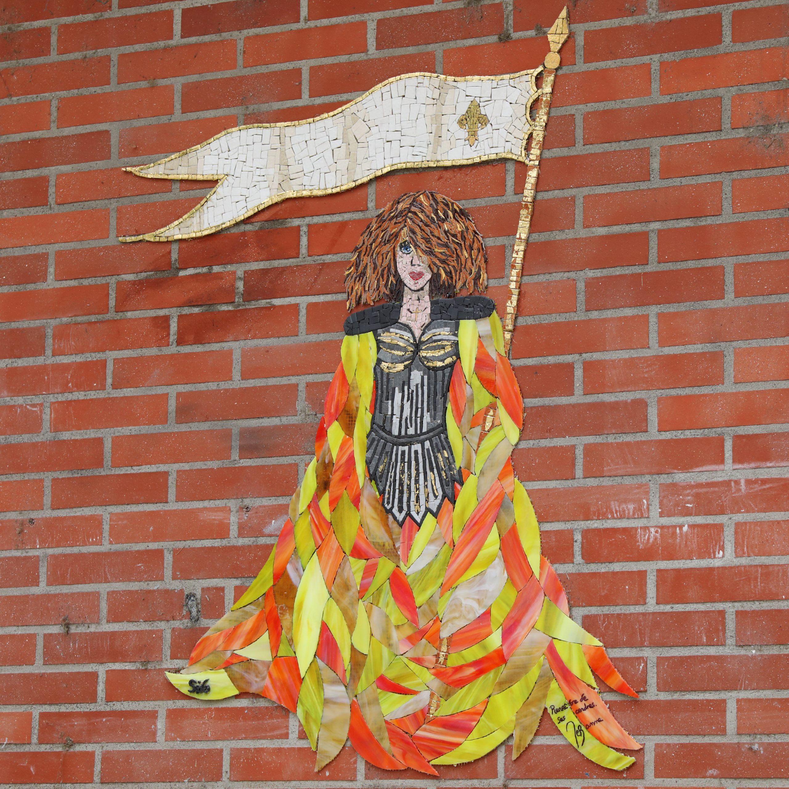 Cette création de street art, réalisée dans les rues d’Orléans, représente Jeanne d’Arc vêtue d’une cape en flammes, symbole de force, de courage et de résilience. Inscrite au bas de sa cape, la phrase « renaître de ses cendres » évoque la capacité à se relever et à se réinventer malgré les épreuves. Chaque détail de la mosaïque et du vitrail accentue l’intensité du mouvement et de l’énergie de cette figure emblématique, offrant un regard poétique et inspirant au cœur de l’espace urbain.