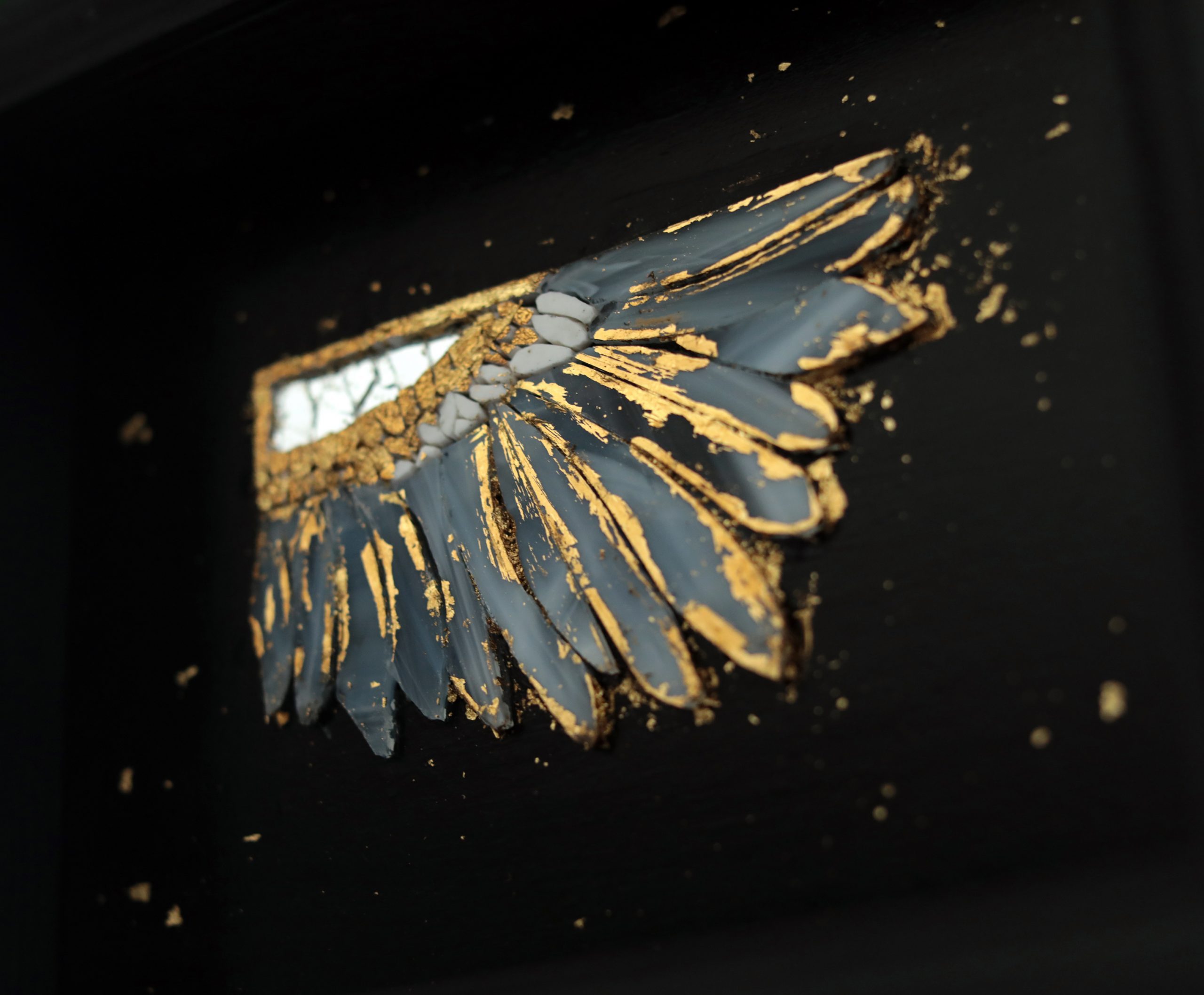 Créé en 2023, le tableau L’aile d’Isis associe vitrail, Émaux de Briare et feuille d’or pour rendre hommage à l’amour maternel et à la puissance protectrice de la déesse.