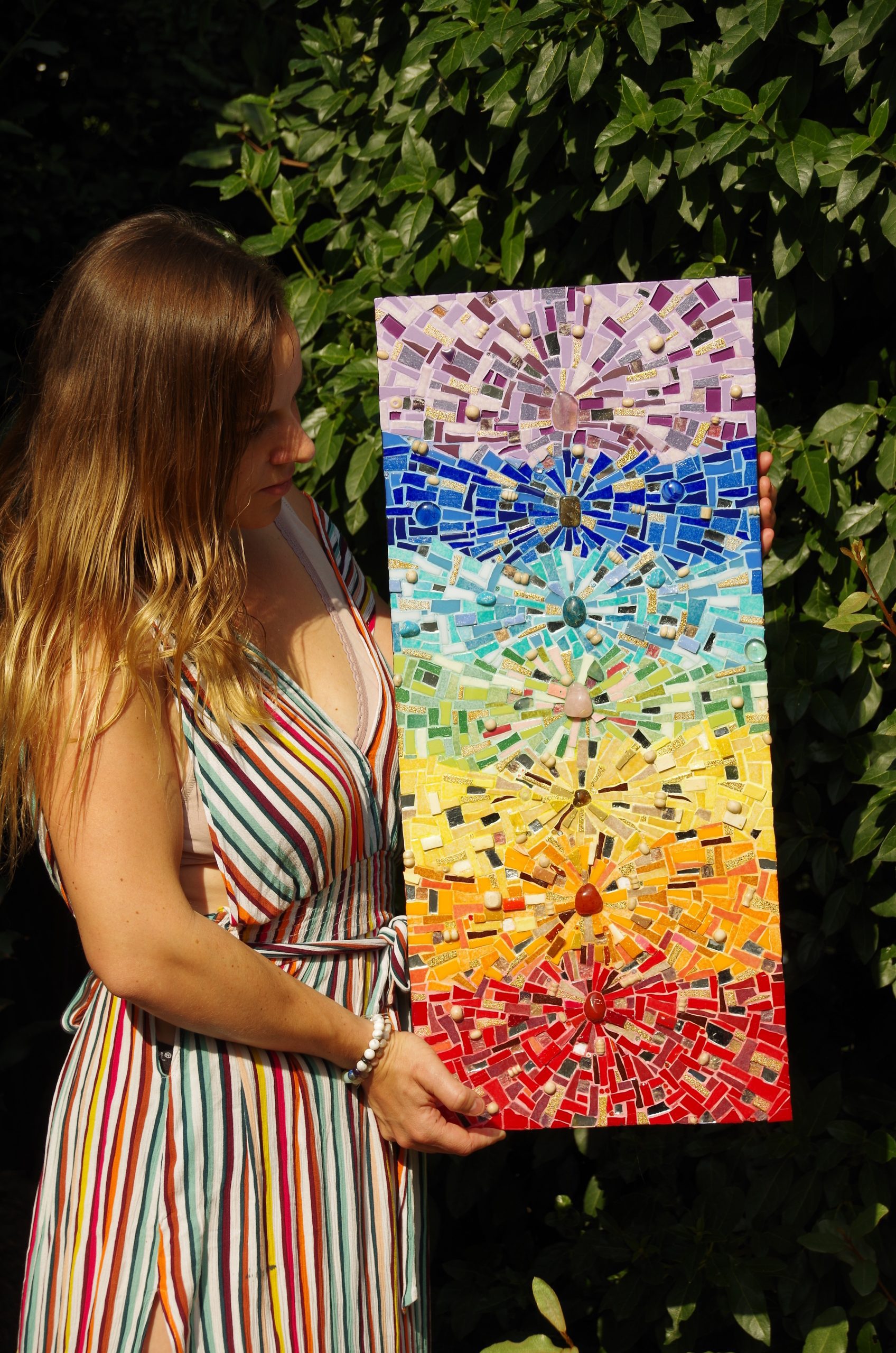 Créée en 2021, Les 7 Chakras est une mosaïque conçue dans le cadre d’une démarche artistique et spirituelle. Elle associe différents matériaux pour exprimer l’harmonie énergétique des centres d’énergie du corps, dans une œuvre lumineuse et profondément symbolique.