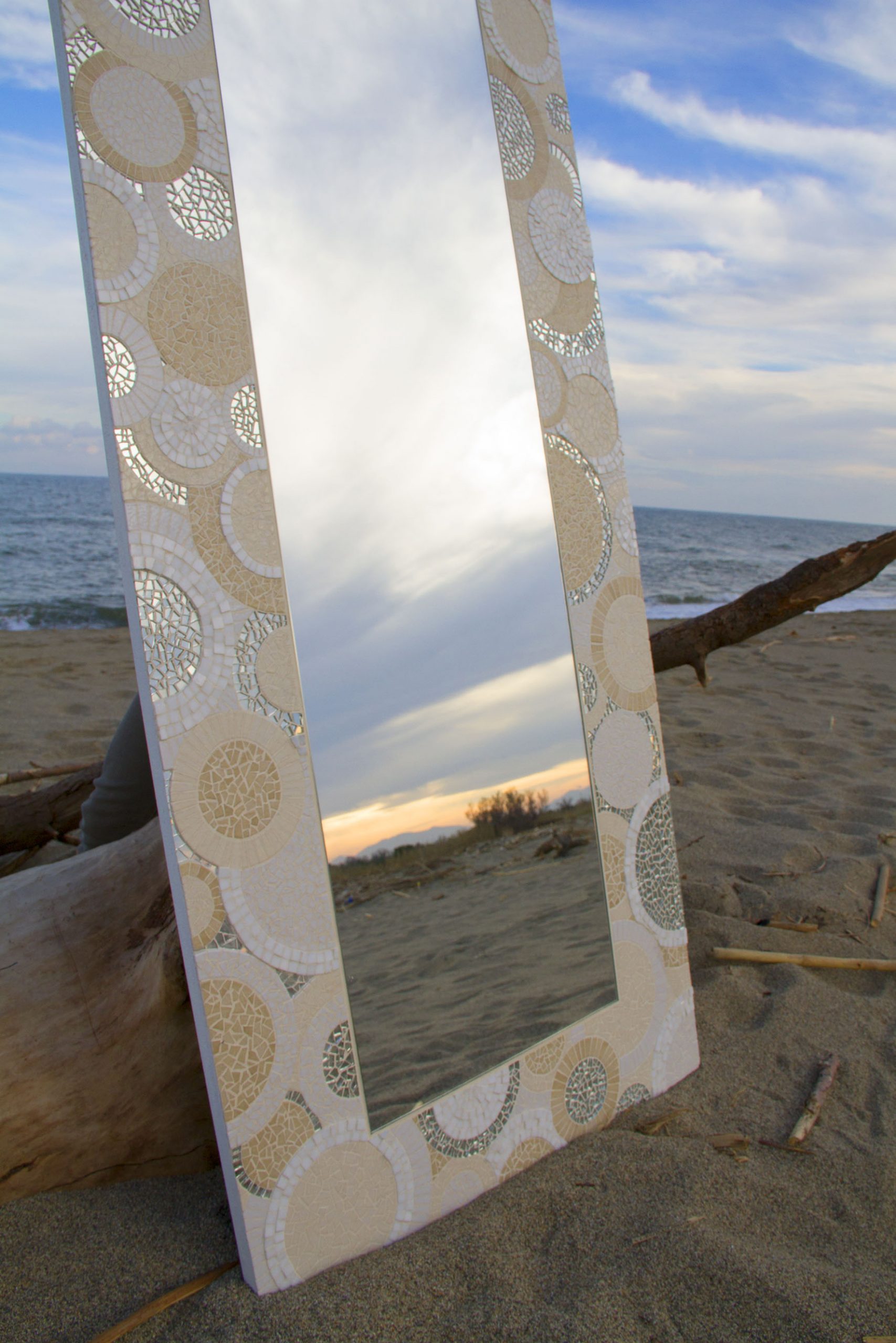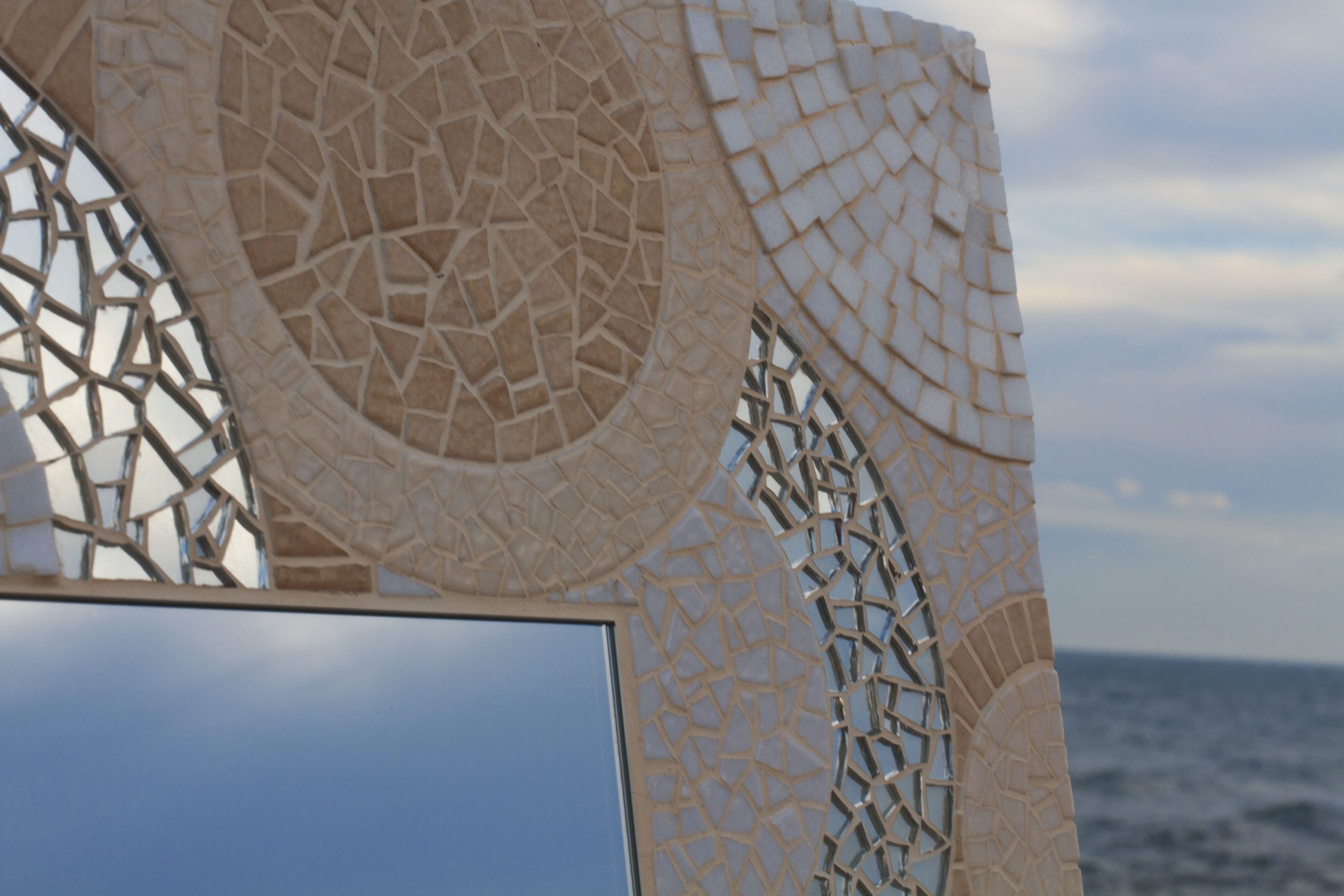 Ce miroir en mosaïque allie douceur et élégance avec des teintes blanc et beige, rehaussées par des éclats de miroir qui captent la lumière. Les formes rondes s’entremêlent avec fluidité, créant un jeu de textures et de reflets unique. Une création décorative qui apporte harmonie, luminosité et mouvement à tout espace intérieur.