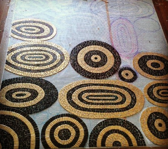 Réalisée en 2016 dans le cadre d’une commande sur mesure, Soleil d’Afrique est une œuvre en mosaïque pensée pour l’extérieur, alliant la brillance des Émaux de Briare à l’élégance de la feuille d’or.